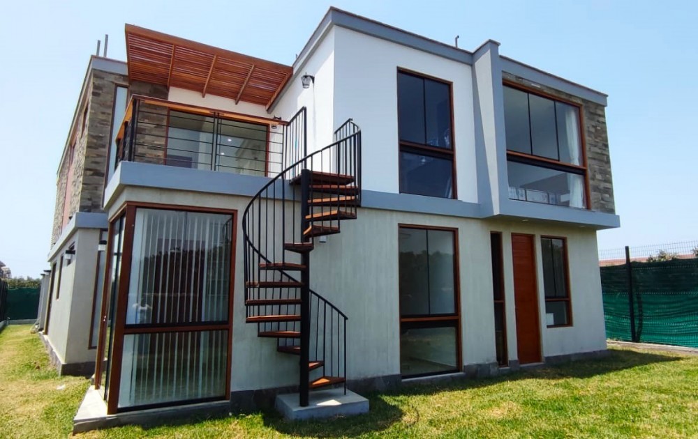 La casa tiene en el interior una chimenea en micro cemento que esta ubicado en el medio de la sala doble altura; tiene una cocina moderna con desayunador y comedor en la parte posterior, tambien cuenta con ambiente de oficina, deposito, dormitorio de servicio y lavandería.