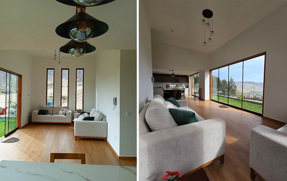 Vivienda Unifamiliar ubicado en el Condominio Country Club - Calango, con un área construida aproximada de 110 m2 con un estilo Minimalista Moderno; con muros de pintura y micro cemento gris claro, zócalos de piedra laja irregular, con doble marco en las ventanas de cemento y madera con marcos encajonados en las mamparas.