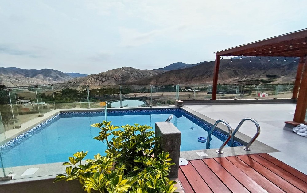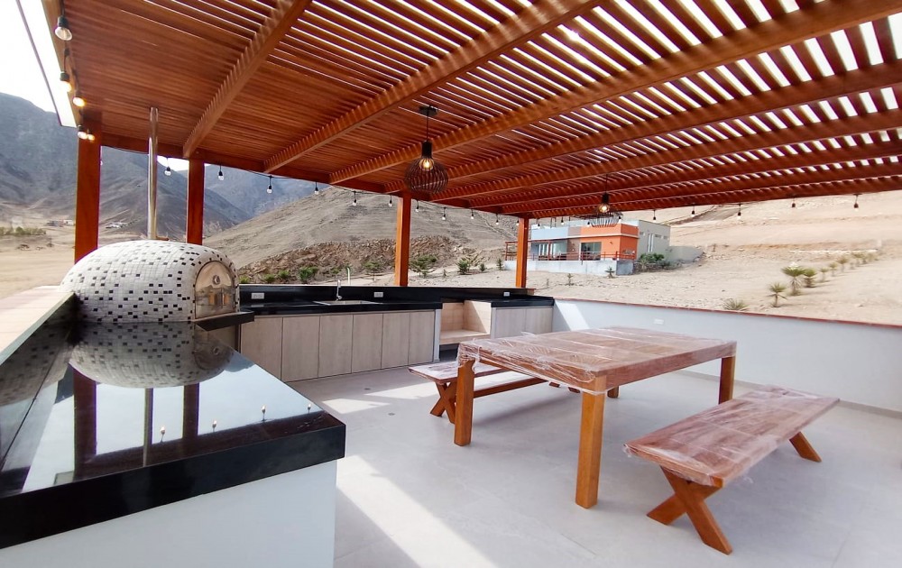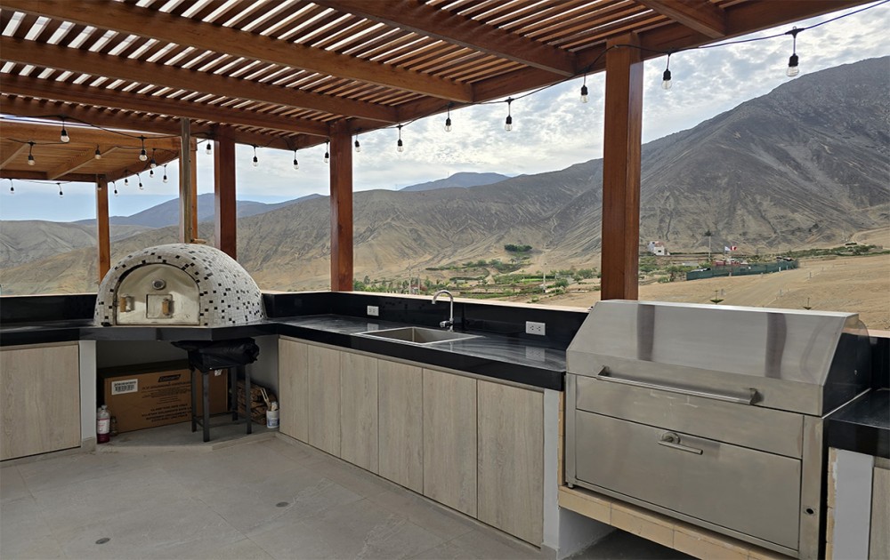 En el segundo nivel tenemos la zona social con una zona de parrillas con un horno artesanal enchapado en pepelma y sol y sombra de madera huayruro en color natural que se integra con la piscina que tiene la vista hacia el bosque.
