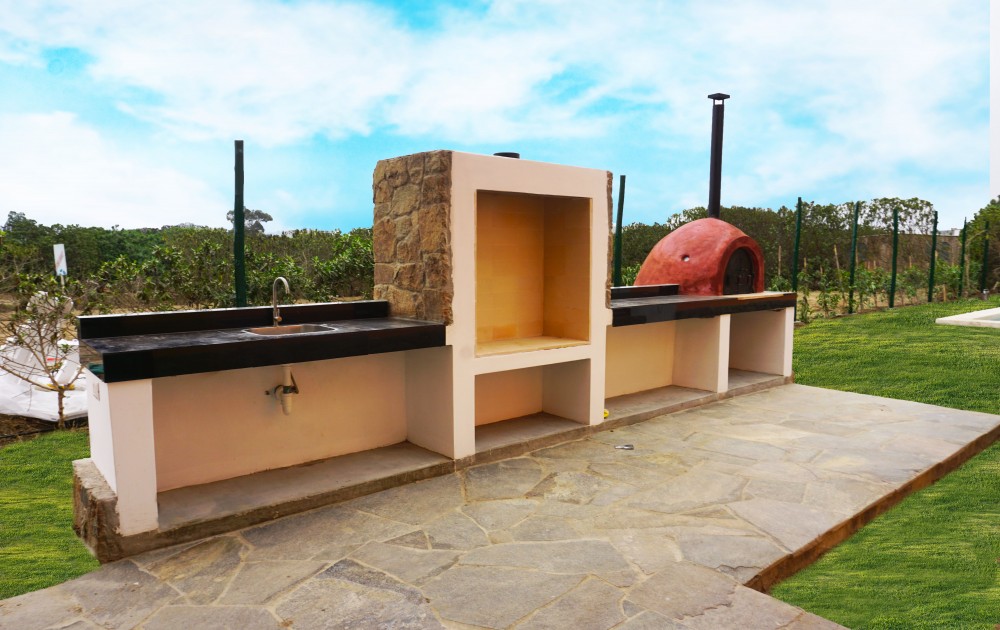 Vivienda Unifamiliar de Campo ubicado en el Condominio Alto Pradera del Sur con área de 103 m2, con un estilo Rústicos, con muros altos de pintura naranja y blanco y chimenea en piedra natural naranja.