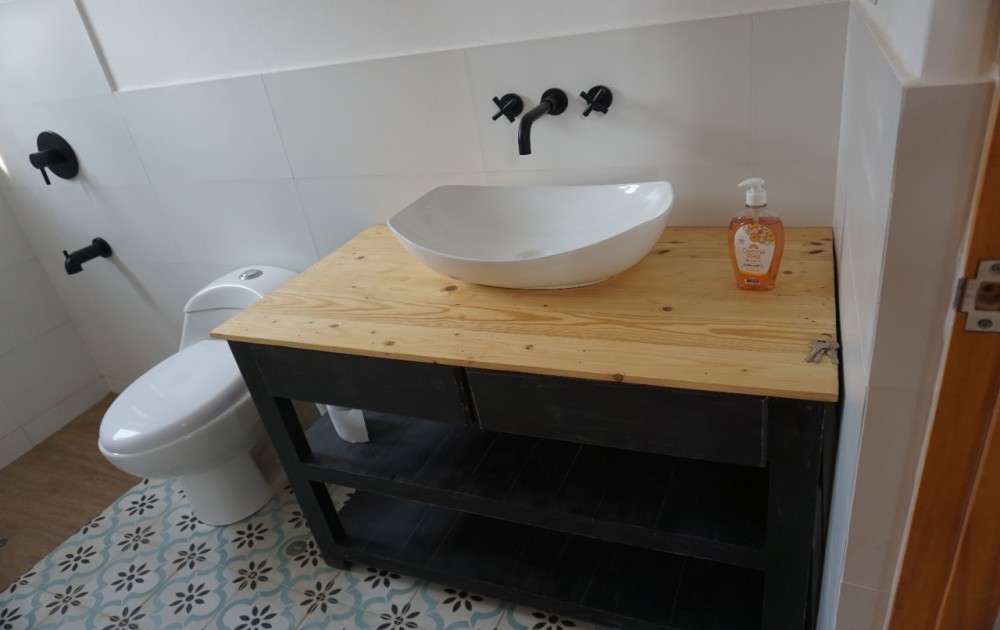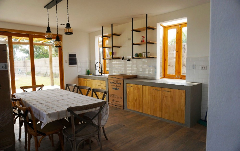 Cuenta con una imponente chimenea doble altura con enchape de piedra roja natural de la zona, techo interior de madera machimbrada y el piso de porcelanato tipo madera en formato tablón con zócalos de madera huayruro. Las mamparas son hechas con marcos de madero al igual que todas las puertas interiores y los muebles de cocina. Ventanas tipo vivero para sentarse a disfrutar el paisaje del jardín.